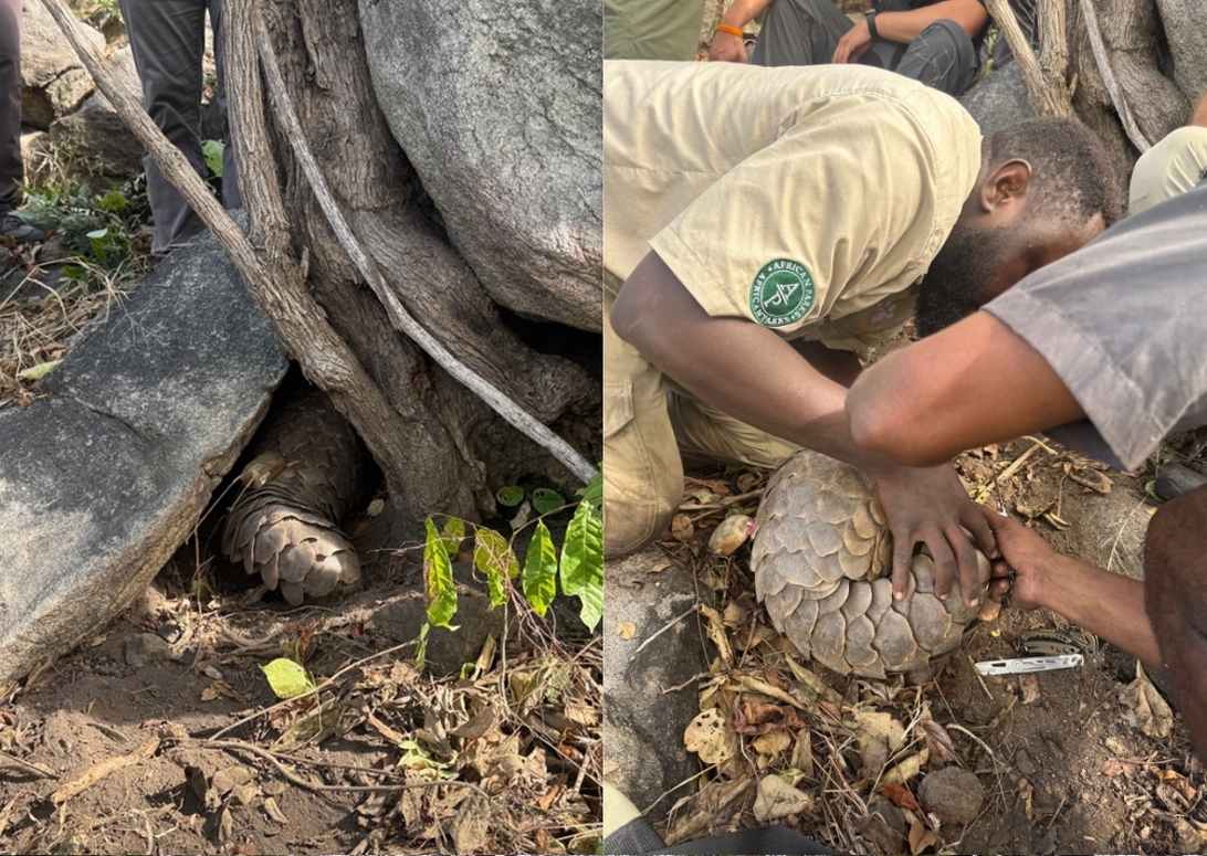 He is a ground pangolin, one of eight species in the world, and he comes in at a triumphant 10.5 kilos, meaning he has been steadily gaining weight. His radio tracker, secured to one of his scales, is working. His habitat is abundant in food and places to hide. There’s just one final job: painlessly shaving away a tiny piece of scale to be taken back to HQ and sent off for DNA sequencing. This is part of a wider effort to trace the origin of pangolins trafficked through the illicit wildlife trade. It will help inform efforts to protect them, whilst ensuring the genetic diversity of those who survive.